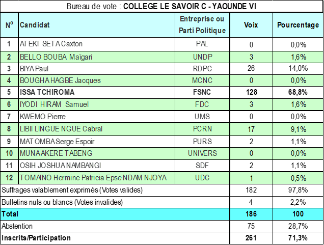 Le choix du peuple a été fait le 12 octobre 2025 au sein des 31 653 bureaux de vote conformément aux indications statistiques fournies par ELECAM. Moi, Babissakana, détenteur de la carte d’électeur n° 11789914, j’ai effectivement voté au bureau de vote « Collège Le Savoir C » de Biyem-Assi à Yaoundé. Conformément à l’article 113 du code électoral, le résultat acquis dans mon bureau de vote a été rendu public. Le tableau ci-après le retrace clairement.