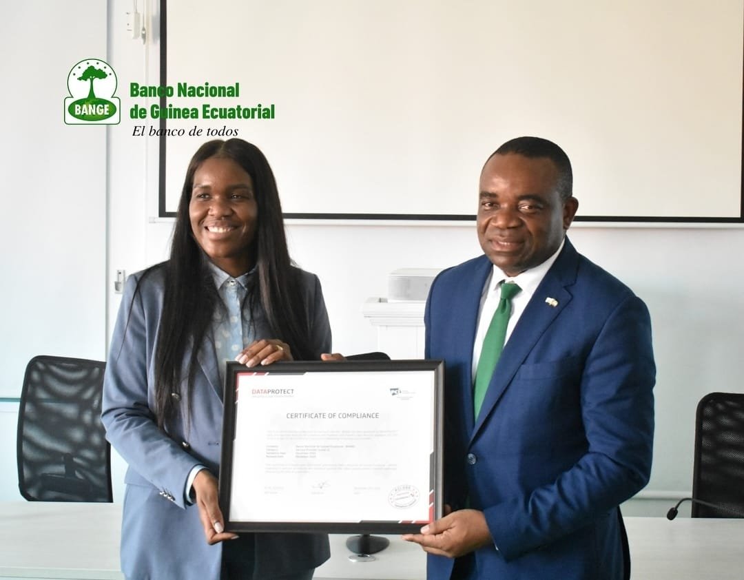 Le document a été remis par Ali EL Azzoui, directeur de Data Protect, aux dirigeants de l’établissement. Cet acte solennel s’est déroulé en présence de Martin Crisanto Ebe Mba, Président du Conseil d’Administration de BANGE, de Jacinto Nsue Osa, Président du Conseil d’Administration de BANGE Bank Cameroun, ainsi que du Directeur Général du groupe, Emilio Moyo Avoro, et de la Directrice Générale Adjointe, Maricruz Engonga Obono.